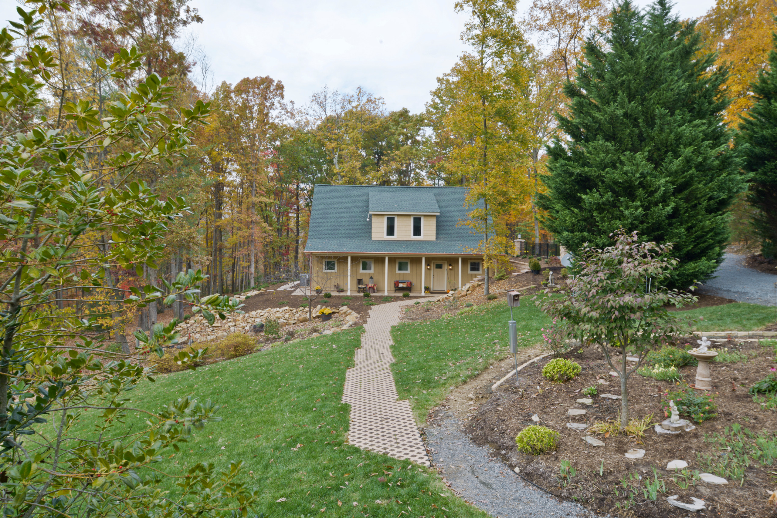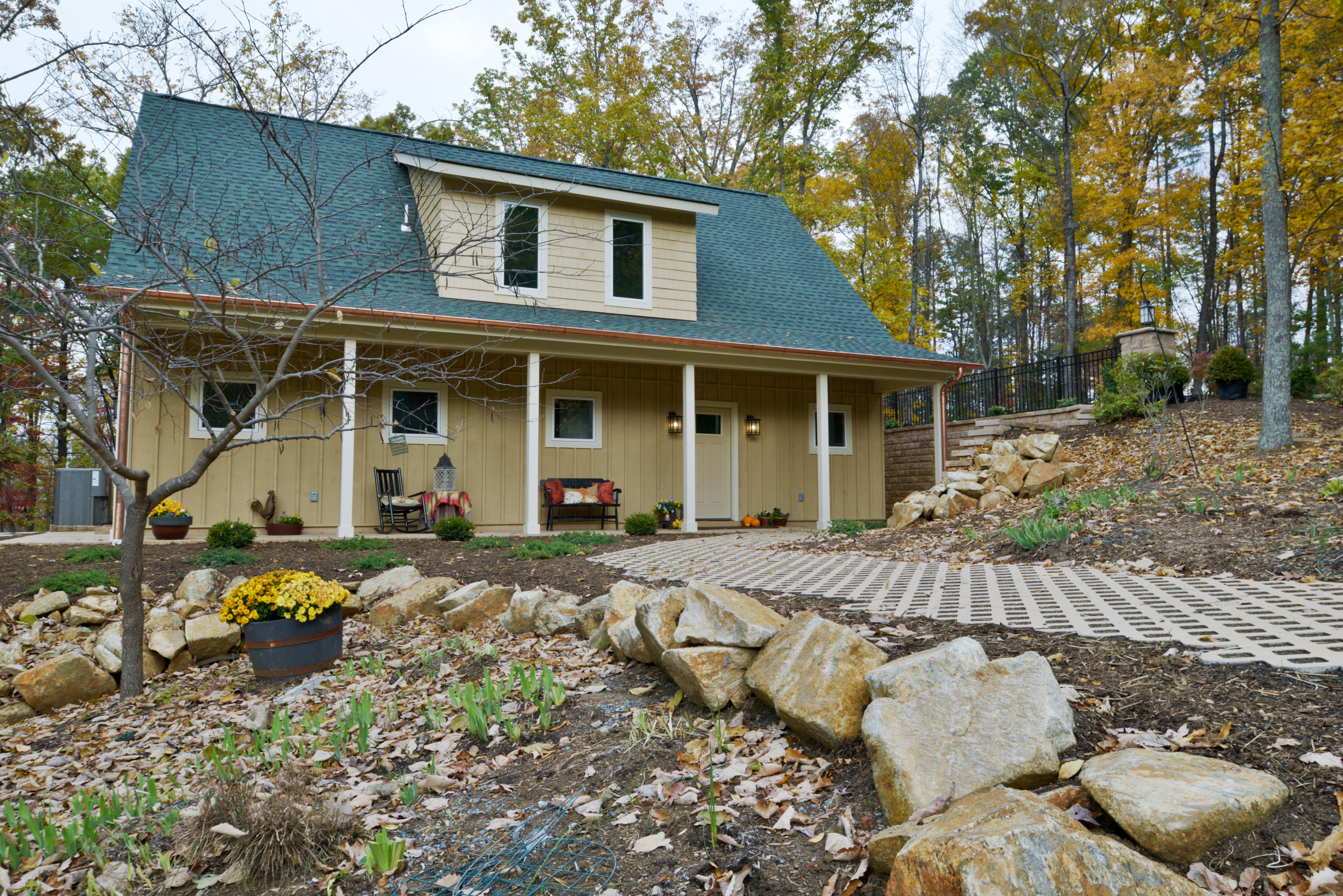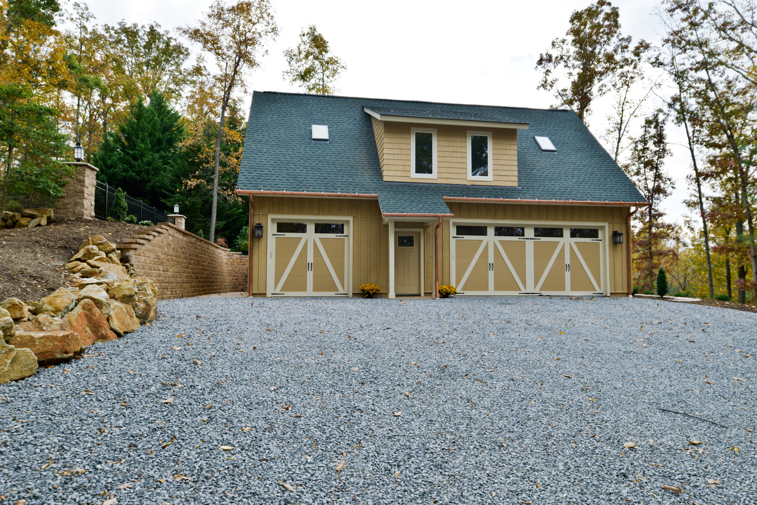 To clear space for the studio, we carved out large amounts of rock from the site and used that rock to landscape the shoulders of the studio site. We also installed large stone stairs leading down the hill to a future pool location. We installed driveway columns with lighting, various plantings, brick paver porches, and architecturally designed sidewalks.
