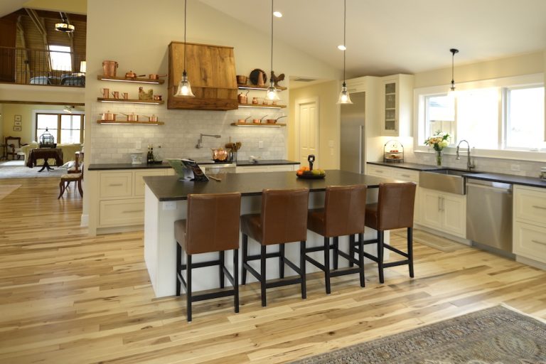 - A custom fabricated kitchen stovetop hood with matching rustic floating shelves on each side of the stovetop, made from reclaimed chestnut wood;